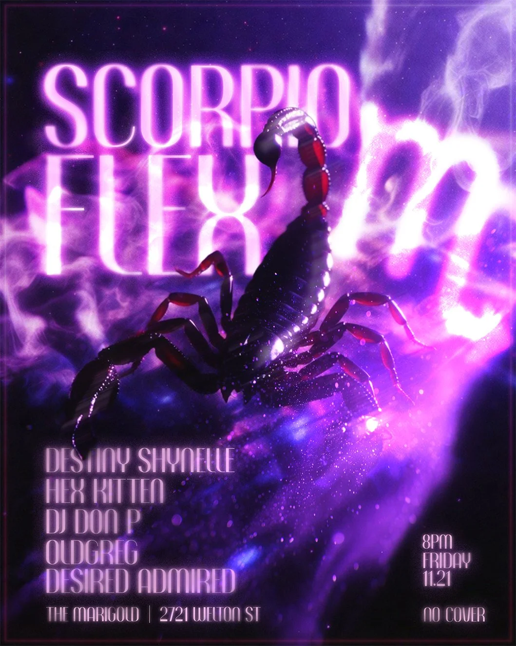 SCORPIO FLEX fall bday extravaganza! Friday, November 21, 2025 8:00 PM 9:00 PM Google Calendar ICS ALL THE BADASS SCORPIO DJS IN DENVER ARE GETTING TOGETHER TO ROCK FOR THE EVENING! COME GET DOWN TO THE SOUNDS OF ALL THE LITTLE SCORPS! 21+ 8 PM NO COVER